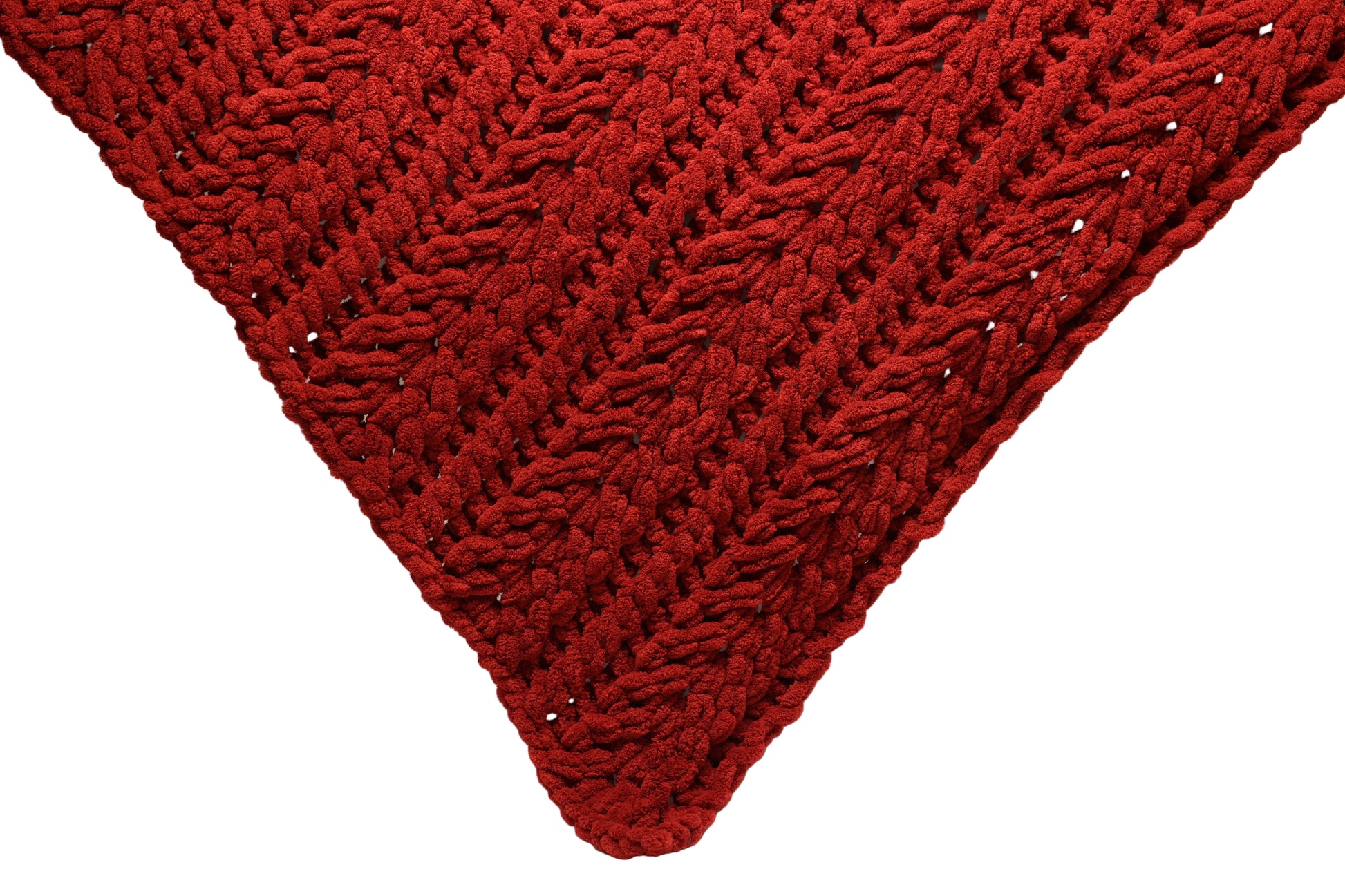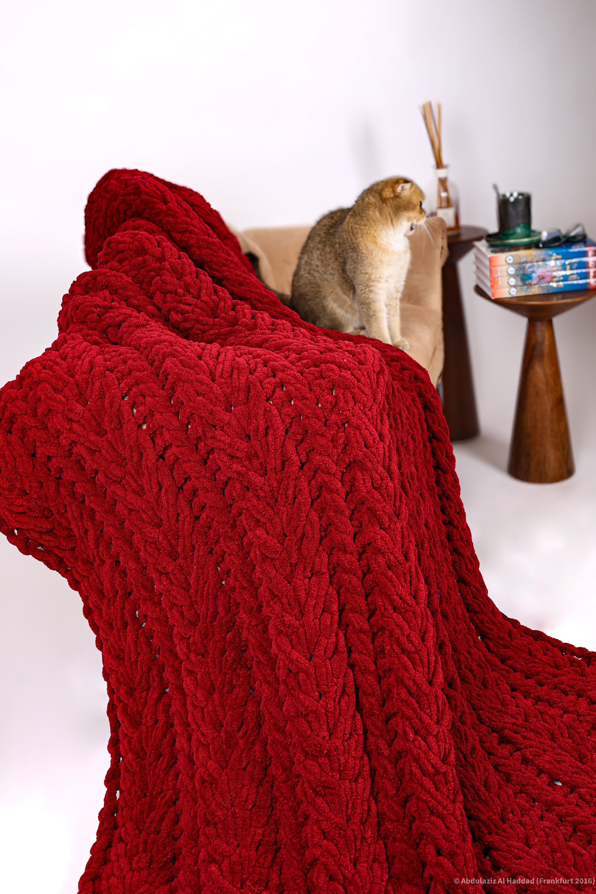 This cozy blanket is crafted in a vibrant blood red color, woven intricately in a braided design for added softness. Made to last for life, simply follow our care instructions. Stay warm and stylish with the Bloody Braid blanket.