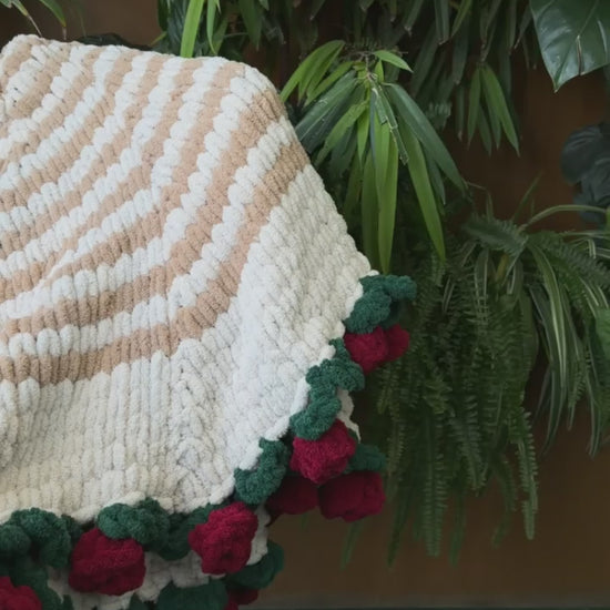 The Strips Beige Red Roses Shawl features an elegant design with red roses, enhancing its visual appeal. Its round shape provides versatile styling options while offering comfort and warmth, making it suitable for various occasions. This accessory effectively combines functionality with aesthetic charm.